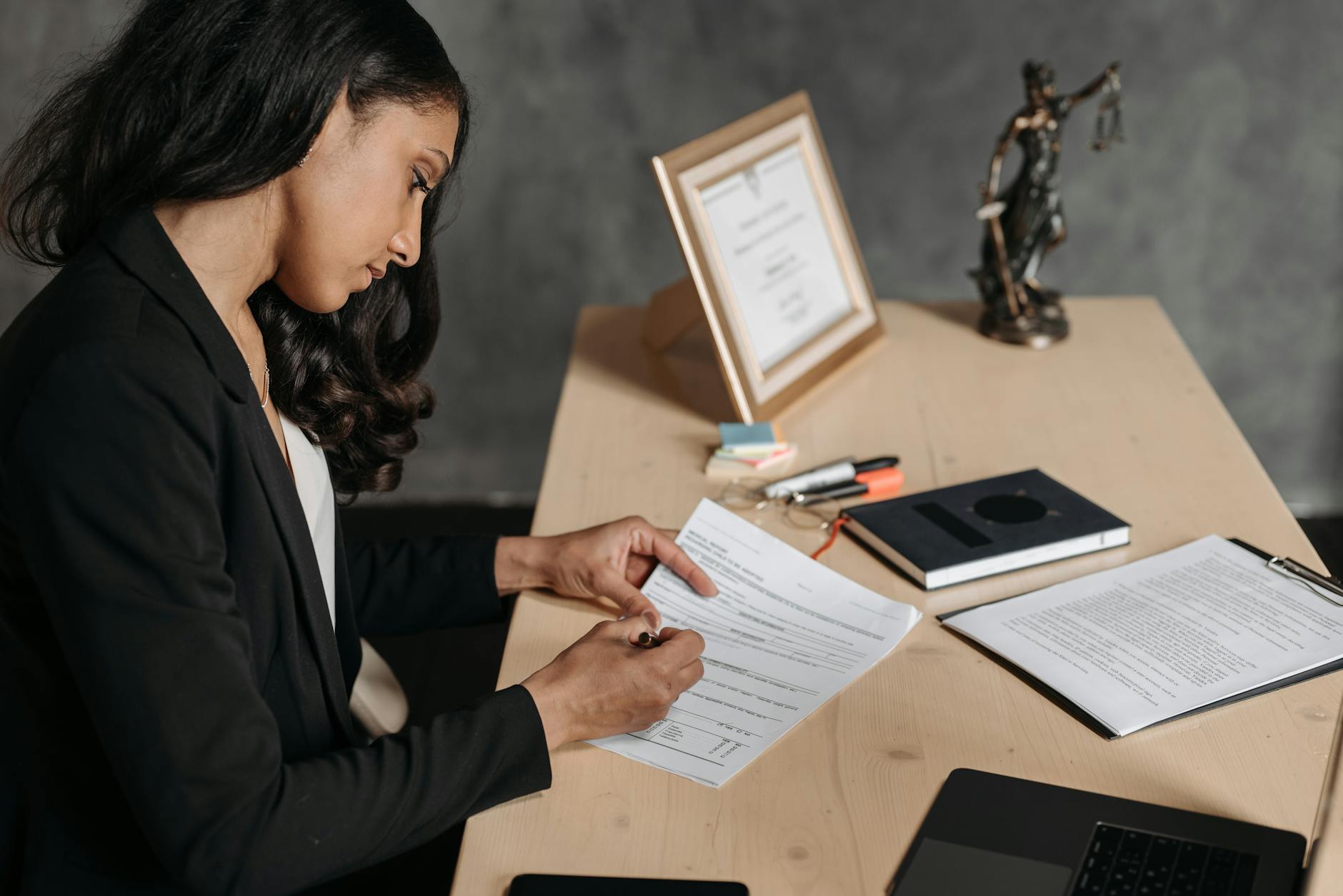 Advogado analisando documentos jurídicos no escritório